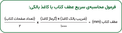 یعنی ضخامت کاغذ 60 گرمی بالک 2 به اندازه 120 میکرون (هزارم میلیمتر) است. برای به دست آوردن عطف کتاب کافی است تعداد ورقهای هر کتاب را در ضخامت هر برگ آن ضرب کنیم و برای اینکه واحد محاسبهمان به میلیمتر باشد، در نهایت باید عدد به دست آمده را بر 1000 تقسیم کنیم. برای مثال، ضخامت یک کتاب 300 صفحهای (150 برگی) با کاغذ 60 گرمی فوق به این صورت محاسبه میشود: